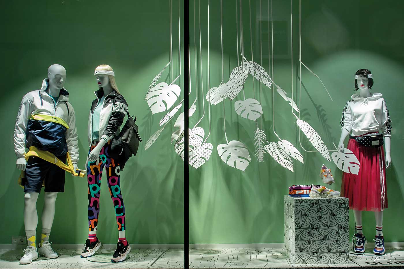 Wild Life Stories steht ganz unter dem Trendthema Dschungel und Animal Print. Kachelartige Anordnung von verschiedenen Blättermotiven zeigen den Blätterurwald im Dschungel. Durch die Quadrate in verschiedenen Ebenen stechen die Accessoires als Highlights auf dem Blätterwald heraus. Die stilisierte Bewegung einer Schlange zeigt die Form einer Welle, die zur Rückwand hin immer höher wird. Das Wechselspiel von gelb zum Schlangen Print verstärkt diese Dynamik und schafft zusätzlich eine weitere Spannung.